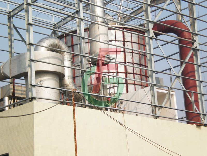 1.塔徑塔高作了相應(yīng)的調(diào)整,既保證粉料干燥之前達不到塔壁,又可保證粉料的熱風停留時間而完成低溫干燥;塔壁設(shè)有夾套冷風冷卻裝置,確保料液不會粘結(jié)在塔壁上因局部溫度過高而產(chǎn)生軟化、熔融甚至焦化現(xiàn)象;錐度增大,錐體上安裝空氣震擊器,用壓縮空氣脈沖式地震擊筒體,把吸附在筒體上的粉料順暢地擊落下來。