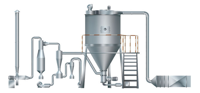 空氣經(jīng)過(guò)濾和加熱,進(jìn)入干燥器頂部空氣分配器,熱空氣呈螺旋狀均勻地進(jìn)入干燥室。料液經(jīng)塔體頂部的高速離心霧化器,(旋轉(zhuǎn))噴霧成極細(xì)微的霧狀液珠,與熱空氣并流接觸在極短的時(shí)間內(nèi)可干燥為成品。成品連續(xù)地由干燥塔底部和旋風(fēng)分離器中輸出,廢氣由引風(fēng)機(jī)排空。