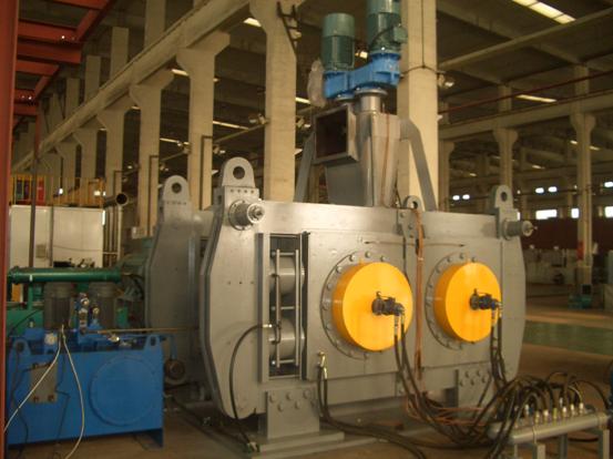 該對輥式壓片造粒機由機架組件,壓輥組件,傳動裝置,液壓緩沖組件及喂料機五部分組成.其工作原理為: 該機利用成對壓輥,彼此留有一定間隙,采用同步控制器控制兩臺電機和減速機,使對輥同步且相向運轉(zhuǎn)。其中一組對輥軸座固定,另一組對輥軸座滑動,藉助液壓缸施壓彼此緊靠,同時液壓系統(tǒng)還起補償作用。壓輥表面有規(guī)則地排列許多形狀、大小相同的穴孔(弧槽),根據(jù)物料對象壓縮比的不同,選擇采用一壓輥穴孔的波谷正好對準另一壓輥的波谷或波峰對準波谷。兩壓輥呈水平布置,粉粒狀物料從兩壓輥上方連續(xù)、均勻地靠自重及擠壓絞龍強制喂入兩壓輥之間,當物料進入咬入?yún)^(qū)后逐漸被壓輥咬入,隨著壓輥的連續(xù)旋轉(zhuǎn),物料占有的空間逐漸減少而被逐步壓縮,并達到成型壓力的最大值,隨后,則壓力逐漸降低,所壓得之壓片,因彈性回復加其壓片自重而脫落壓輥弧槽,接下來進入切碎、整粒裝置并篩分至粒狀產(chǎn)品。