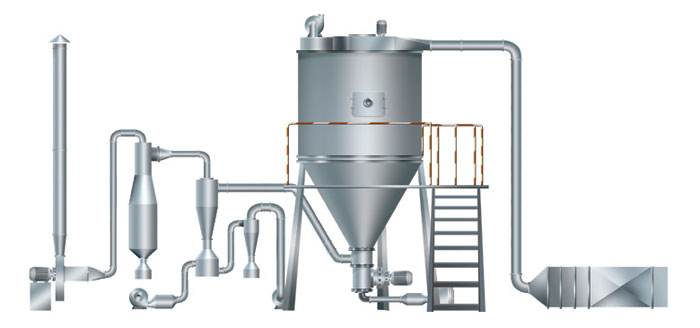 空氣經(jīng)過濾和加熱,進入干燥器頂部空氣分配器,熱空氣呈螺旋狀均勻地進入干燥室。料液經(jīng)塔體頂部的高速離心霧化器,(旋轉(zhuǎn))噴霧成極細微的霧狀液珠,與熱空氣并流接觸在極短的時間內(nèi)可干燥為成品。成品連續(xù)地由干燥塔底部和旋風分離器中輸出,廢氣由風機排空。